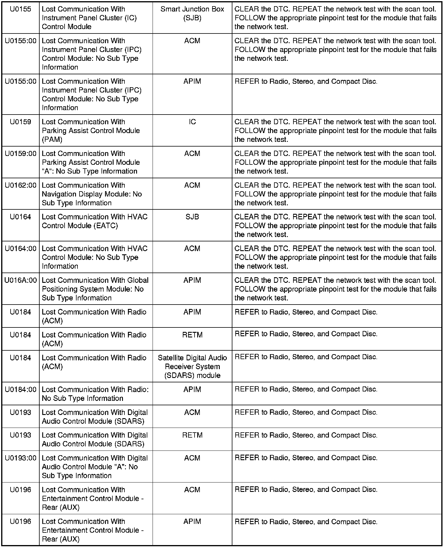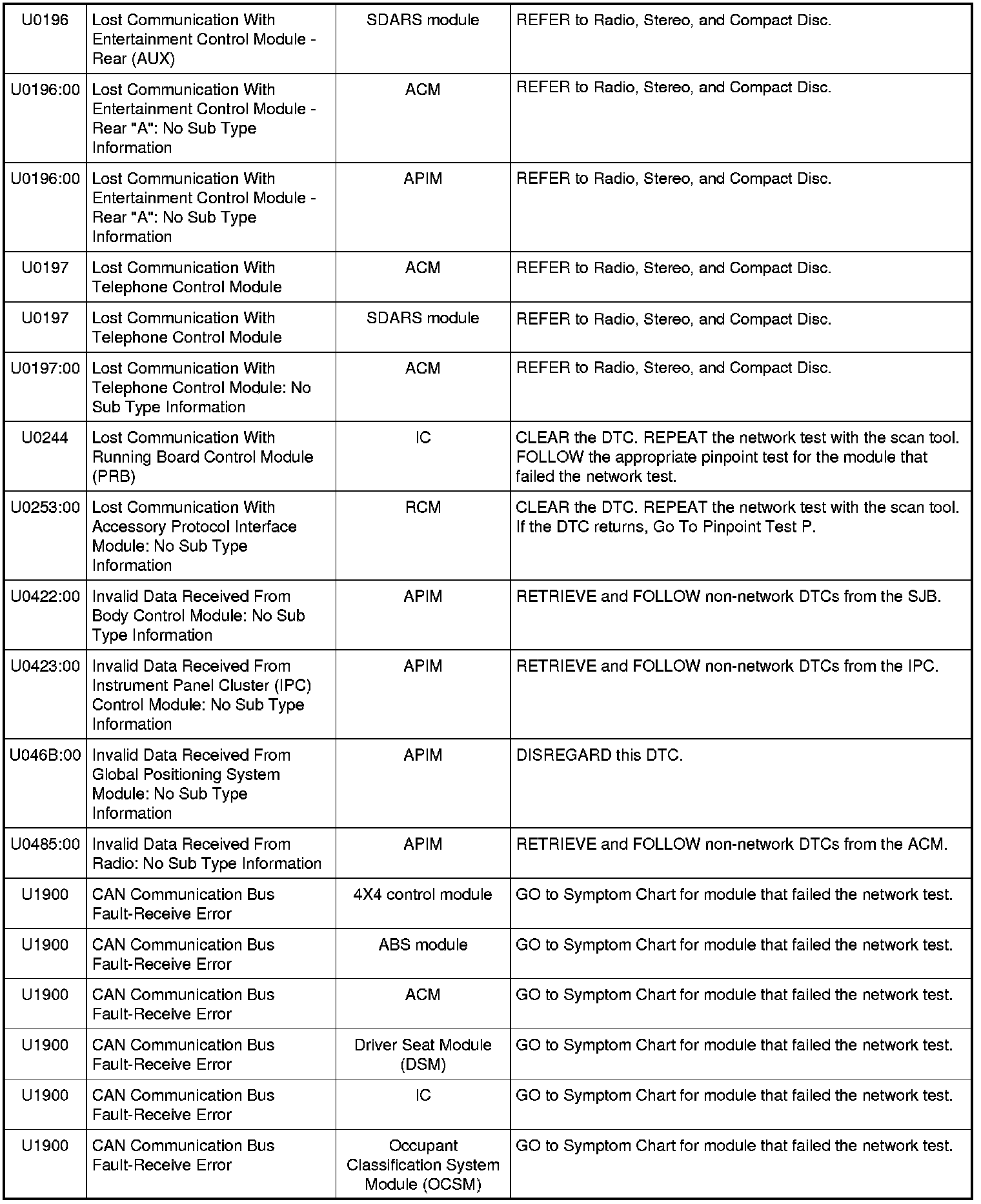 NOTE: Network DTCs (U-codes) are often a result of intermittent concerns such as damaged wiring or low battery voltage occurrences. Additionally, vehicle service procedures such as module reprogramming will often set network DTCs. Replacing a module to resolve a network DTC is unlikely to resolve the concern. To prevent repeat network DTC concerns, inspect all network wiring, especially connectors. Test the vehicle battery, refer to Battery.