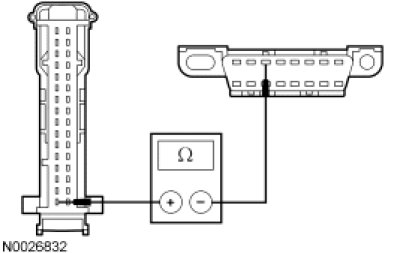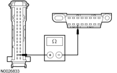 - Measure the resistance between the SJB C2280d-16, circuit VDB06 (GY/OG), harness side and the DLC C251-3, circuit VDB06 (GY/OG), harness side.