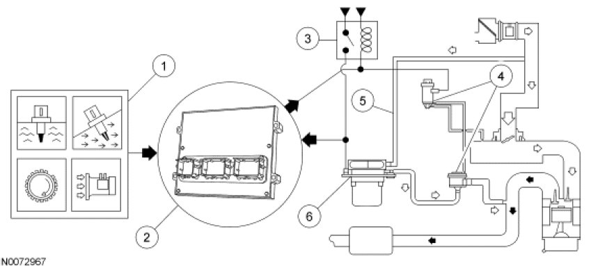 2. When the engine is started, the strategy determines when to enable the secondary AIR pump. The PCM signals the AIR relay and the AIR bypass solenoid, after a 5 to 15 second delay, to begin system operation. Once the catalyst is lit-off, the PCM then signals the AIR relay to stop secondary AIR pump operation and to close the AIR bypass solenoid from supplying vacuum to the AIR diverter valve.