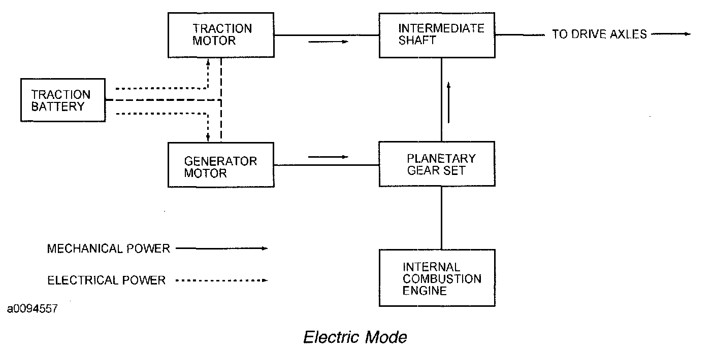 The hybrid electric system operates in the electric mode when the vehicle is propelled by the electrical power stored in the high voltage traction battery. The torque is supplied to the output shafts by the traction motor, the generator motor, or a combination of both. This is a preferred mode whenever the desired torque is low and the electrical system, rather than the engine, can produce it more efficiently. The electric mode is also used in reverse because the engine can deliver torque only in a forward direction.