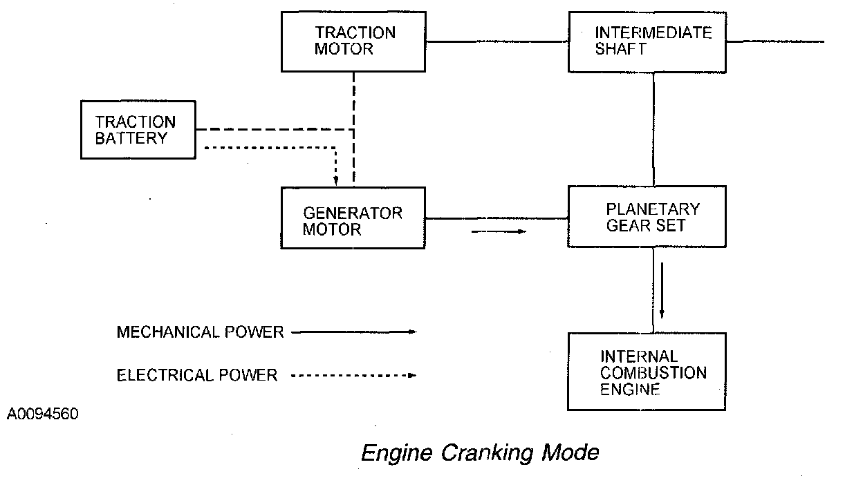 The electronically controlled CVT provides the engine cranking function to start or restart the internal combustion engine. When the PCM requests the engine cranking mode, the generator motor rapidly accelerates the engine speed up to about 1,000 RPM in about 0.3 seconds. When the engine speed reaches a calibrated speed the PCM commands the delivery of fuel and spark at the appropriate times.