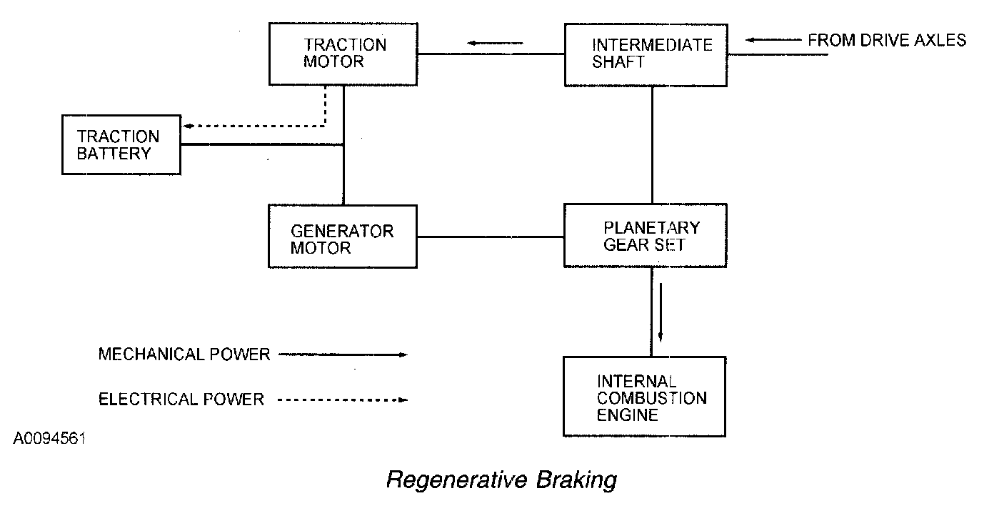 The regenerative braking is a software strategy and is controlled by the PCM, the TCM, and the TBCM. Regenerative braking is the ability to capture and store a portion of the energy that would be lost as heat during a braking event. When the driver applies the brakes, the PCM determines how much negative torque (braking force) the traction motor should provide in addition to the friction brakes. Depending on the high voltage traction battery state of charge, the amount of negative torque provided by traction motor can vary between 0 and 100 percent. The traction motor then becomes a generator, which causes the energy to flow into the high voltage traction battery. The PCM strategy smoothly blends regenerative and friction brake effort to make the dual brake operation transparent to the driver.