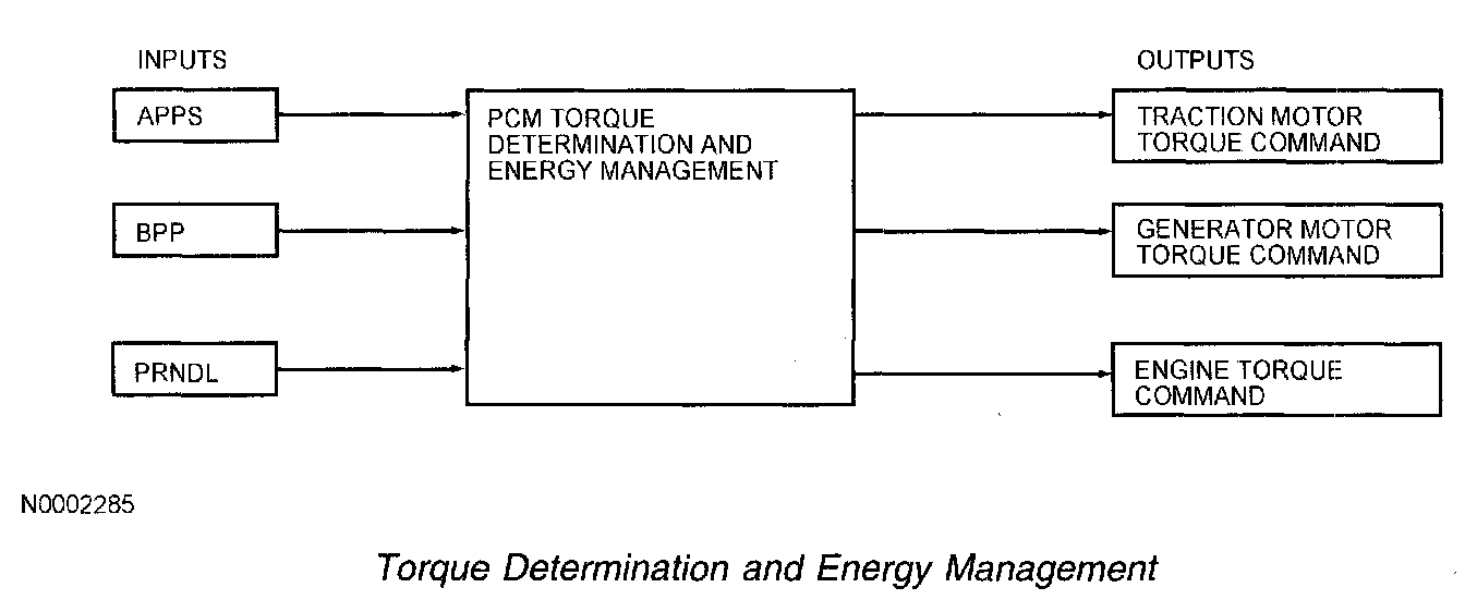 The PCM is responsible for torque determination and energy management functions. The PCM monitors gear selector position (PRNDL), brake pedal position (BPP) and accelerator pedal position (APPS). The PCM then makes a torque command determination. Positive torque is perceived as vehicle acceleration and negative torque is perceived as braking. Based on the amount of torque requested by the driver, the PCM decides which power source has to deliver the torque to meet the driver demand while the powertrain system is running most efficiently.