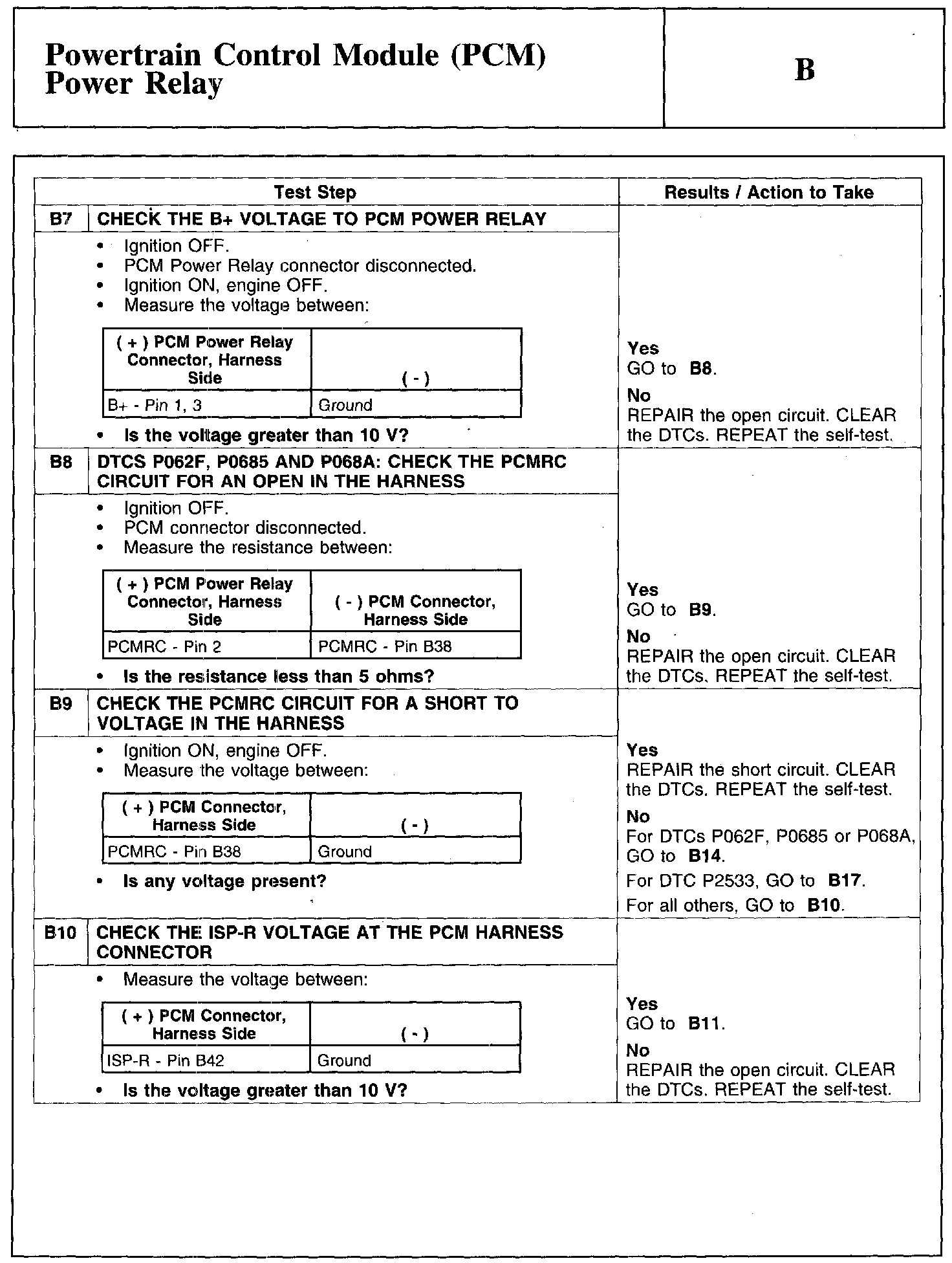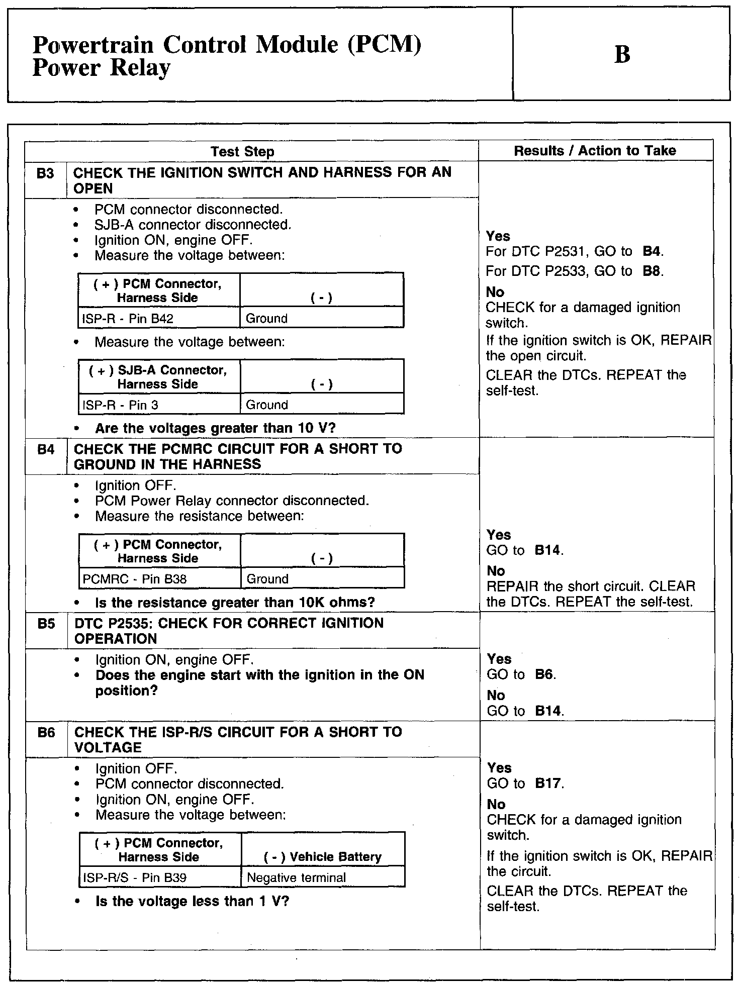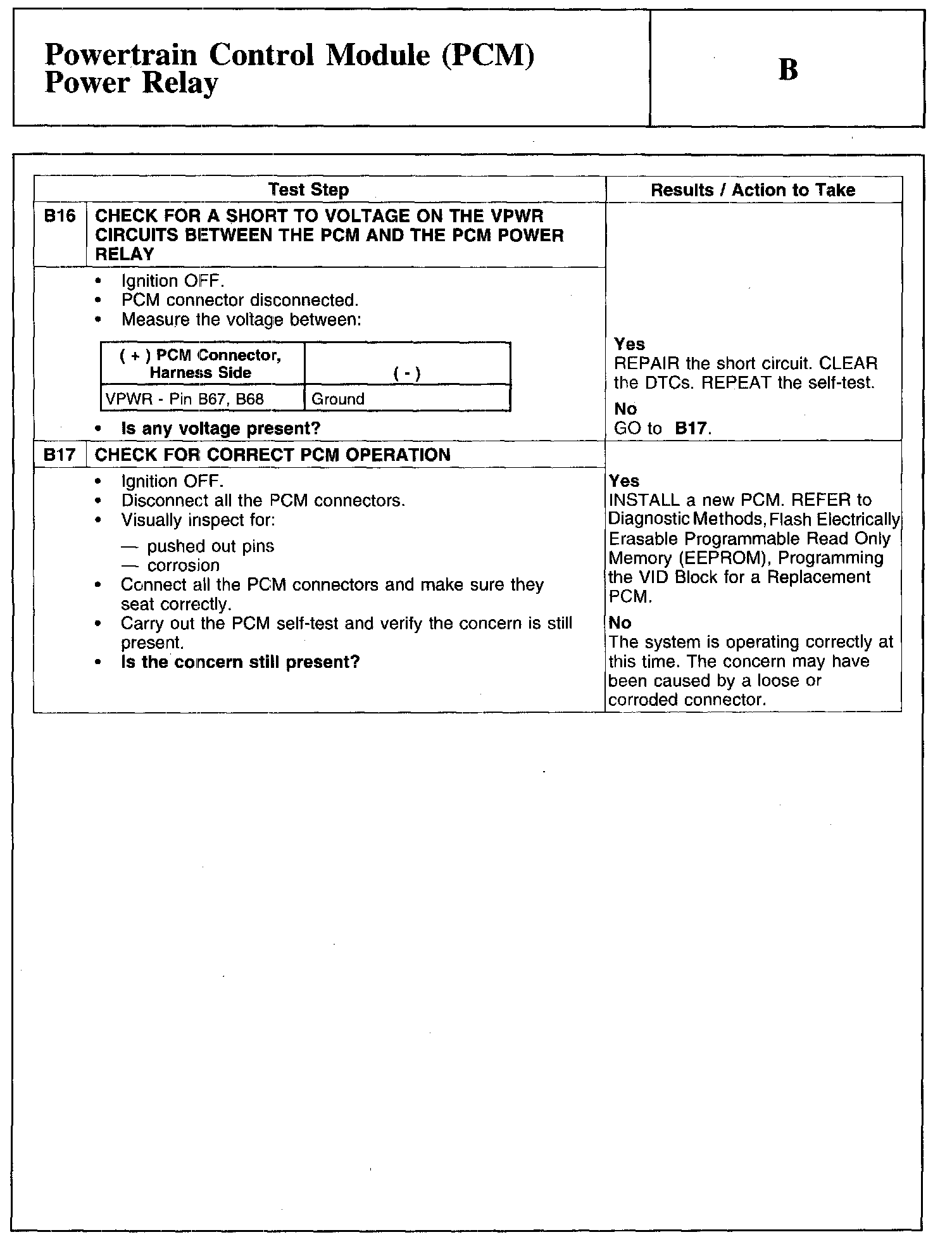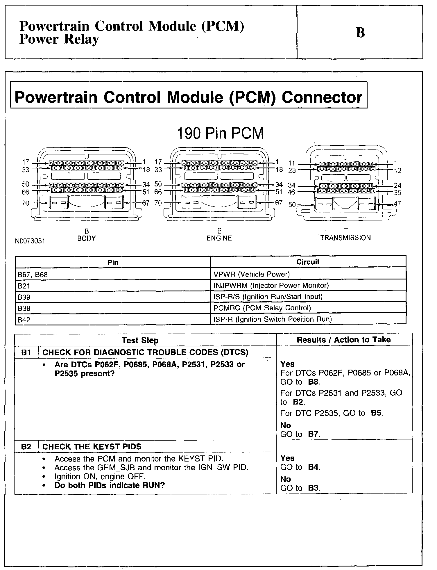 PINPOINT TEST B: POWERTRAIN CONTROL MODULE (PCM) POWER RELAYWarning And Fuel Injector Connector: