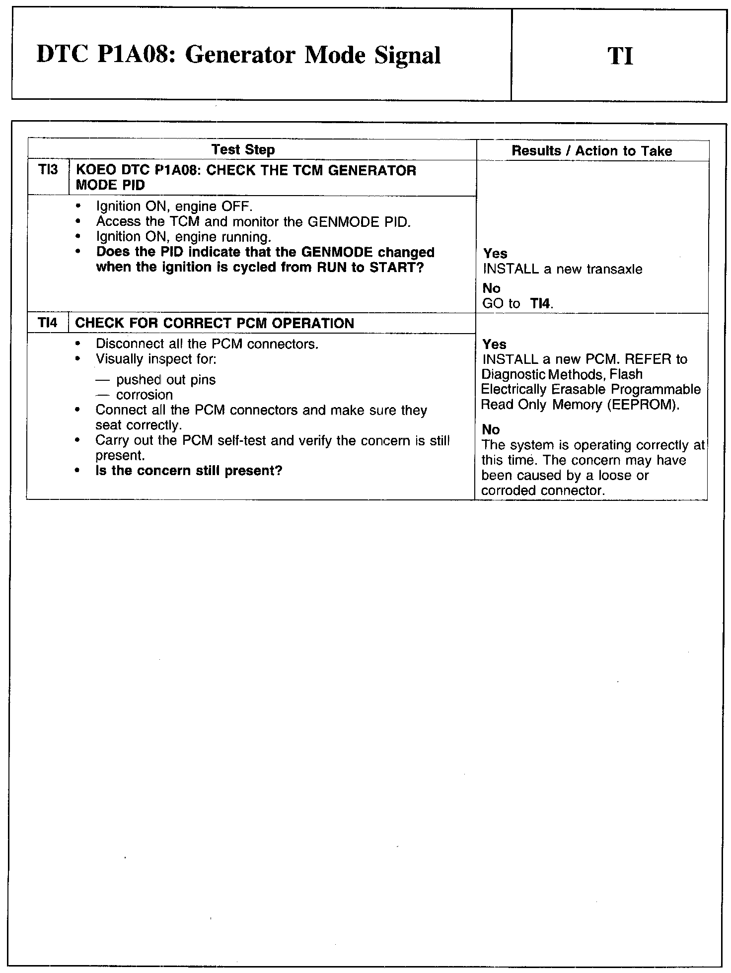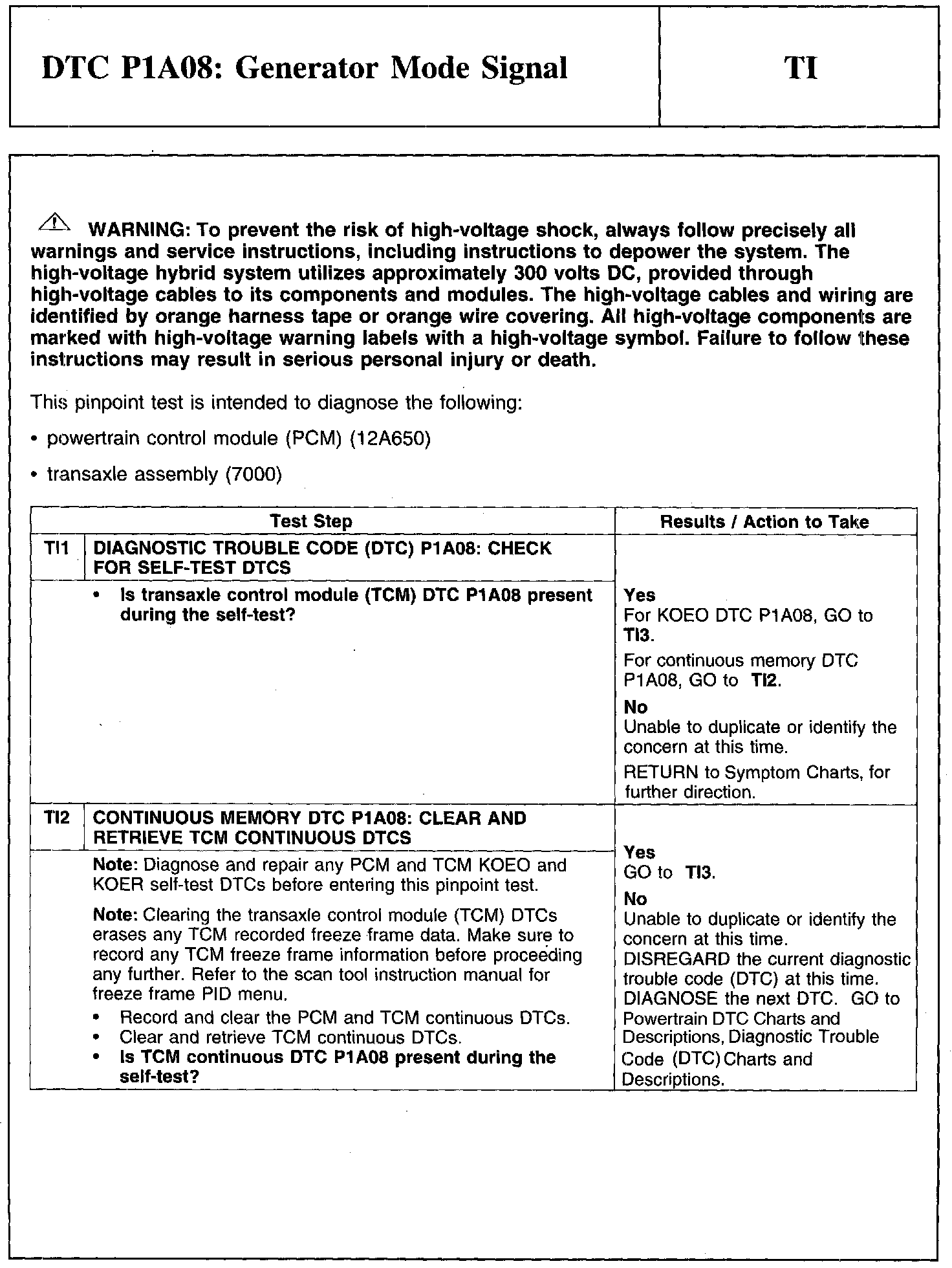 Test TI: DTC P1A08: Generator Mode Signal