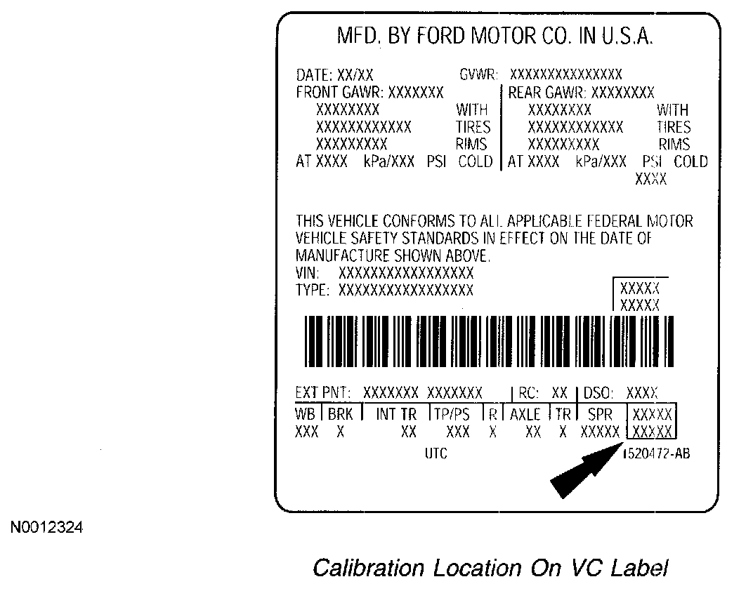 Base engine calibration information, also referred to as the powertrain calibration, is located in the lower right corner of the VC label. Engine calibration information is limited to a maximum of five characters per line (two lines maximum). Calibration information more than five characters long wraps to the second line of this field. Only the base calibration appears on this label. The revision level is no longer printed on the label; however, it can be found in On-line Automotive Service Information System (OASIS). For more information on VC label or engine calibration, refer to the Vehicle/Application and ID, Identification Codes.
