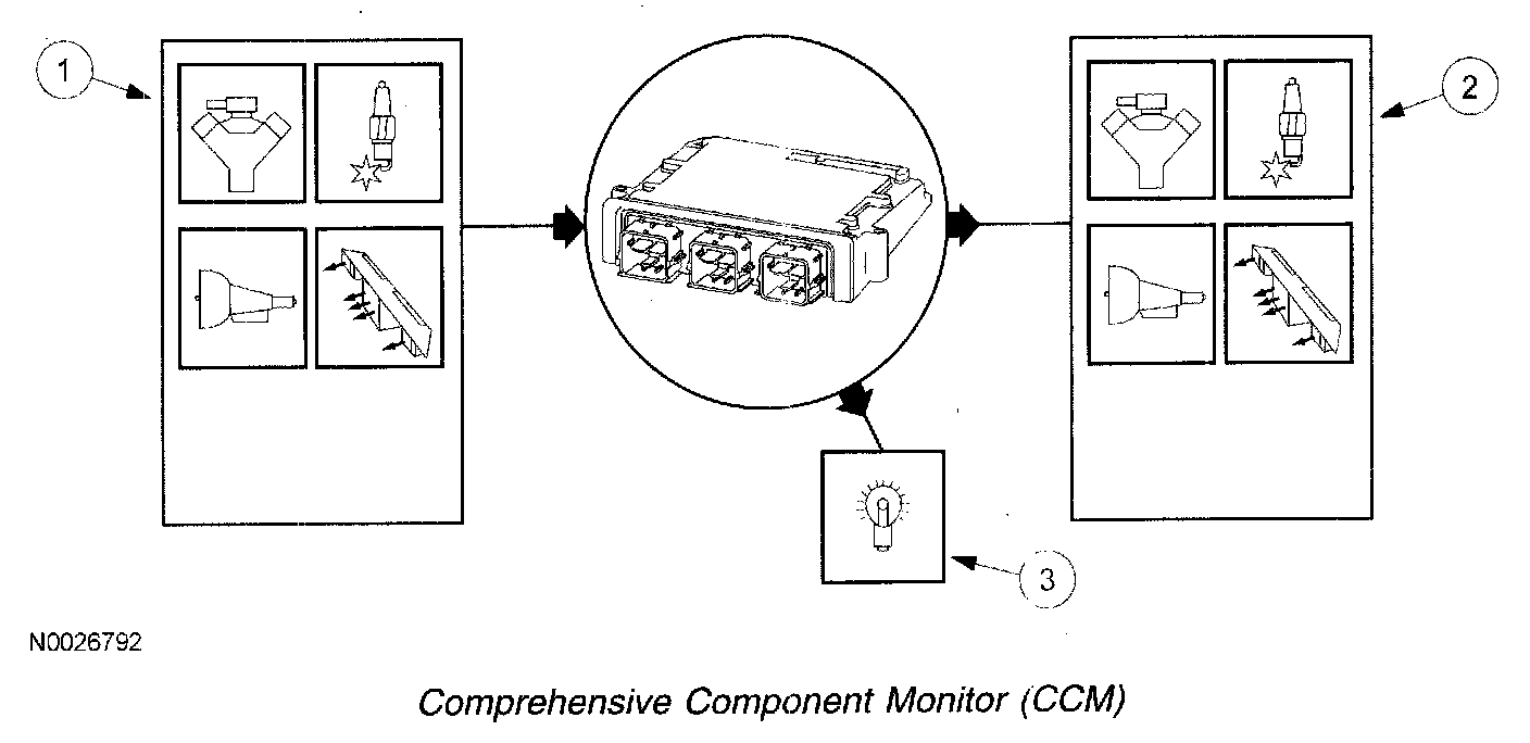 3. The CCM is enabled after the engine starts and is running. A diagnostic trouble code (DTC) is stored in keep alive memory (KAM) and the malfunction indicator lamp (MIL) is illuminated after two drive cycles when a concern is detected. Many of the CCM tests are also carried out during the on-demand self-test.