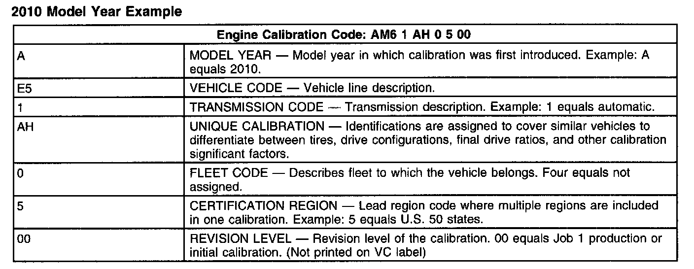 Base engine calibration information, also referred to as the powertrain calibration, is located in the lower right corner of the VC label. Engine calibration information is limited to a maximum of five characters per line (two lines maximum). Calibration information more than five characters long wraps to the second line of this field. Only the base calibration appears on this label. The revision level is no longer printed on the label; however, it can be found in On-line Automotive Service Information System (OASIS). For more information on VC label or engine calibration, refer to the Vehicle/Application and ID, Identification Codes.