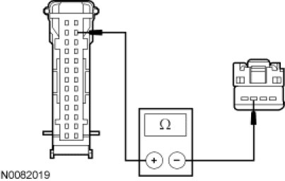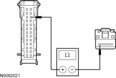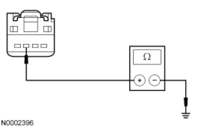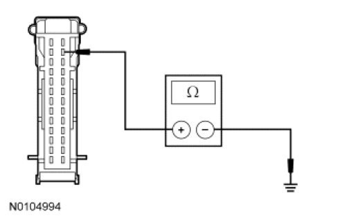 - Measure the resistance between the PATS transceiver C2007-4, circuit VRT23 (VT/GY), harness side and ground.