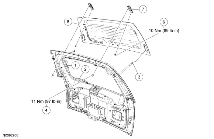 2. Position the liftgate trim panel aside to access the liftgate window glass electrical connectors and the 2 liftgate window glass hinge-to-glass screws.
