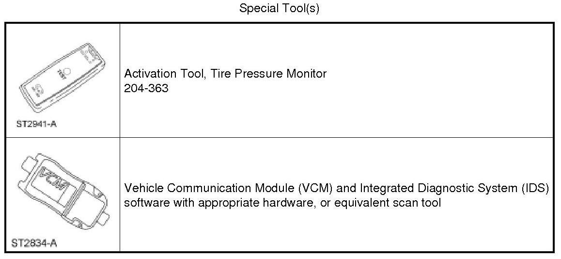 NOTE: The tire pressure sensor training procedure must be done on a single vehicle, in an area without Radio Frequency Interference (RFI) and at least 1 m (3 ft) away from other vehicles equipped with a Tire Pressure Monitoring System (TPMS).