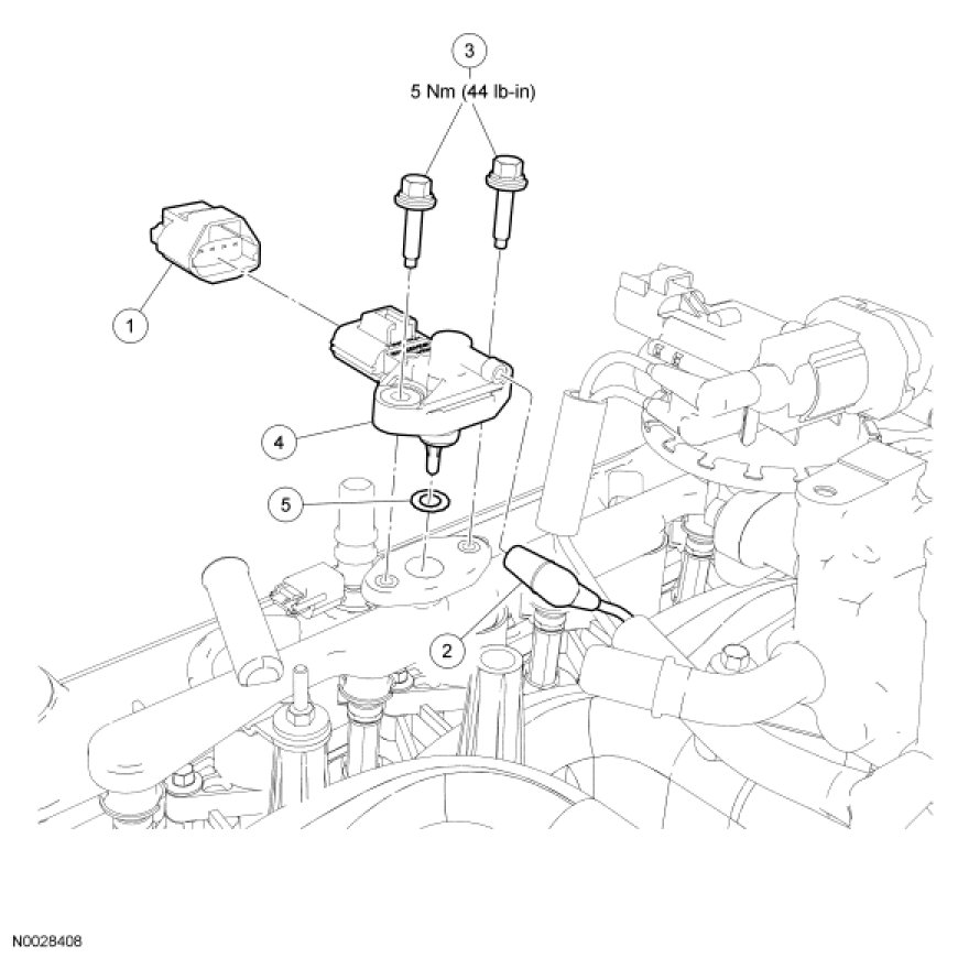 5. Remove the 2 bolts and the fuel rail pressure and temperature sensor.