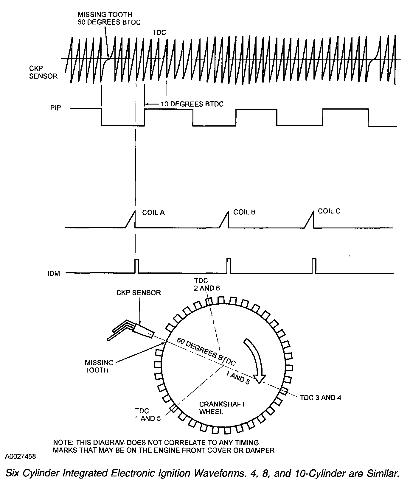 1. The CKP sensor indicates the crankshaft position and speed by sensing a missing tooth on a pulse wheel mounted to the crankshaft. The CMP sensor is used by the COP integrated electronic ignition system to identify the compression stroke of cylinder 1 and to synchronize the firing of the individual coils.