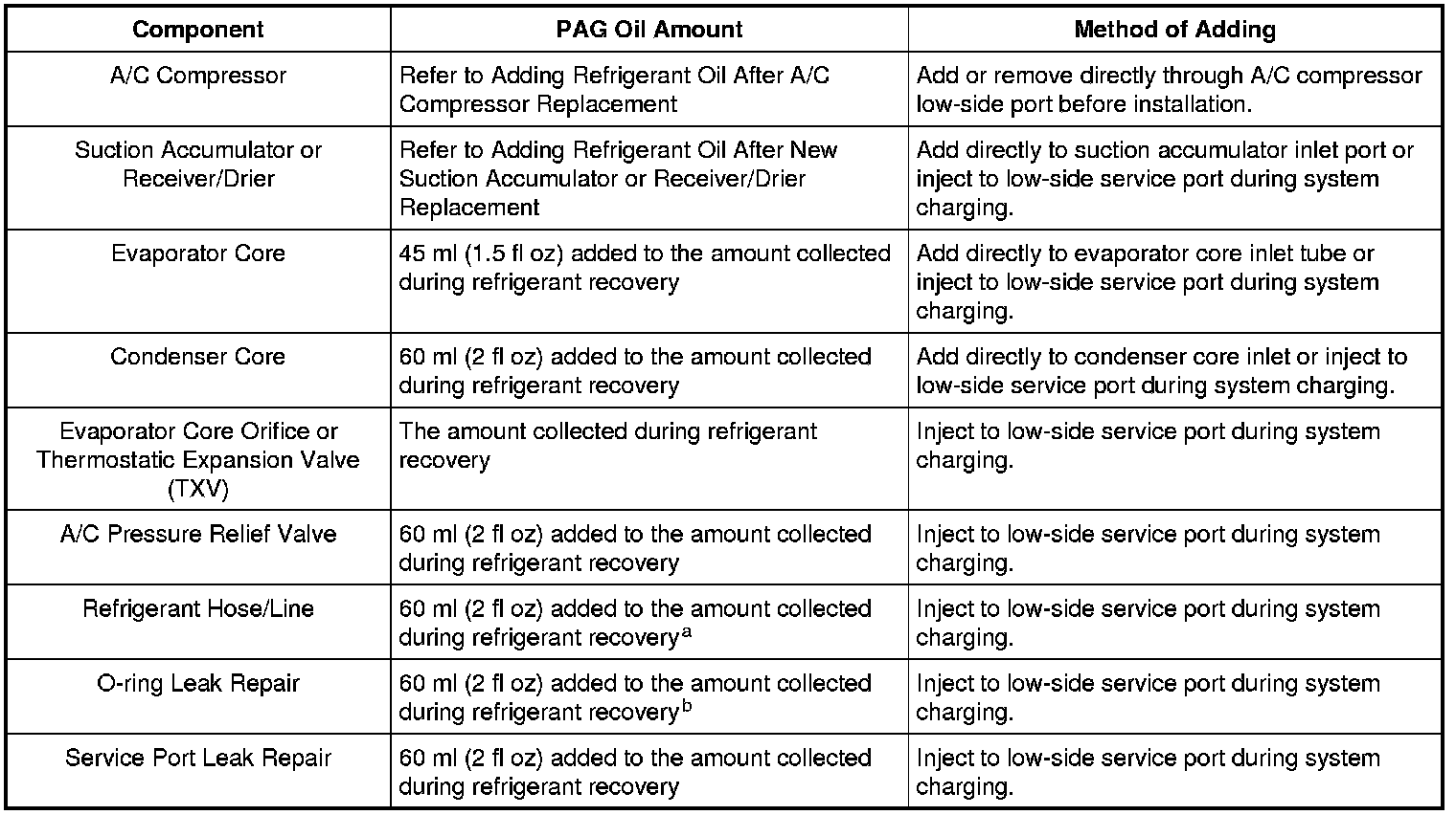 a If an excessive amount of PAG oil is lost due to a hose rupture/separation or other damage, the total system PAG oil capacity must be added.