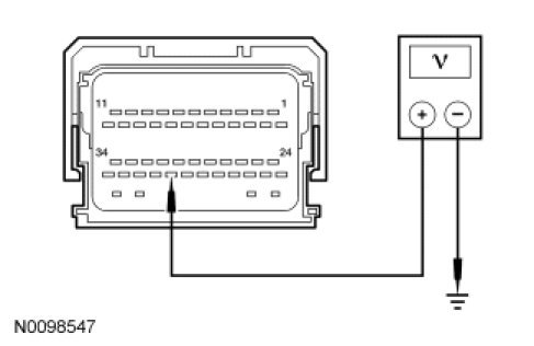 - Measure the voltage between ground and PCM C175T-42, circuit CH307 (GY/BU), harness side.