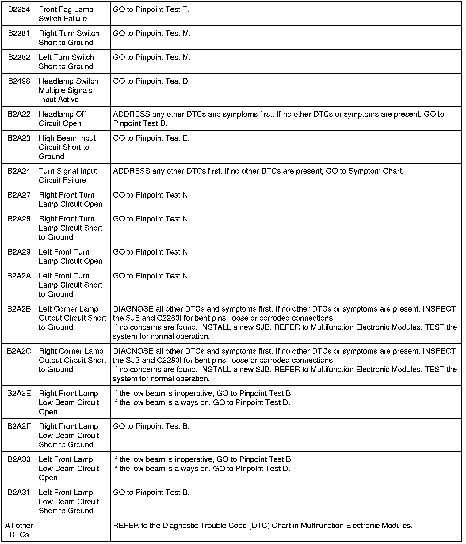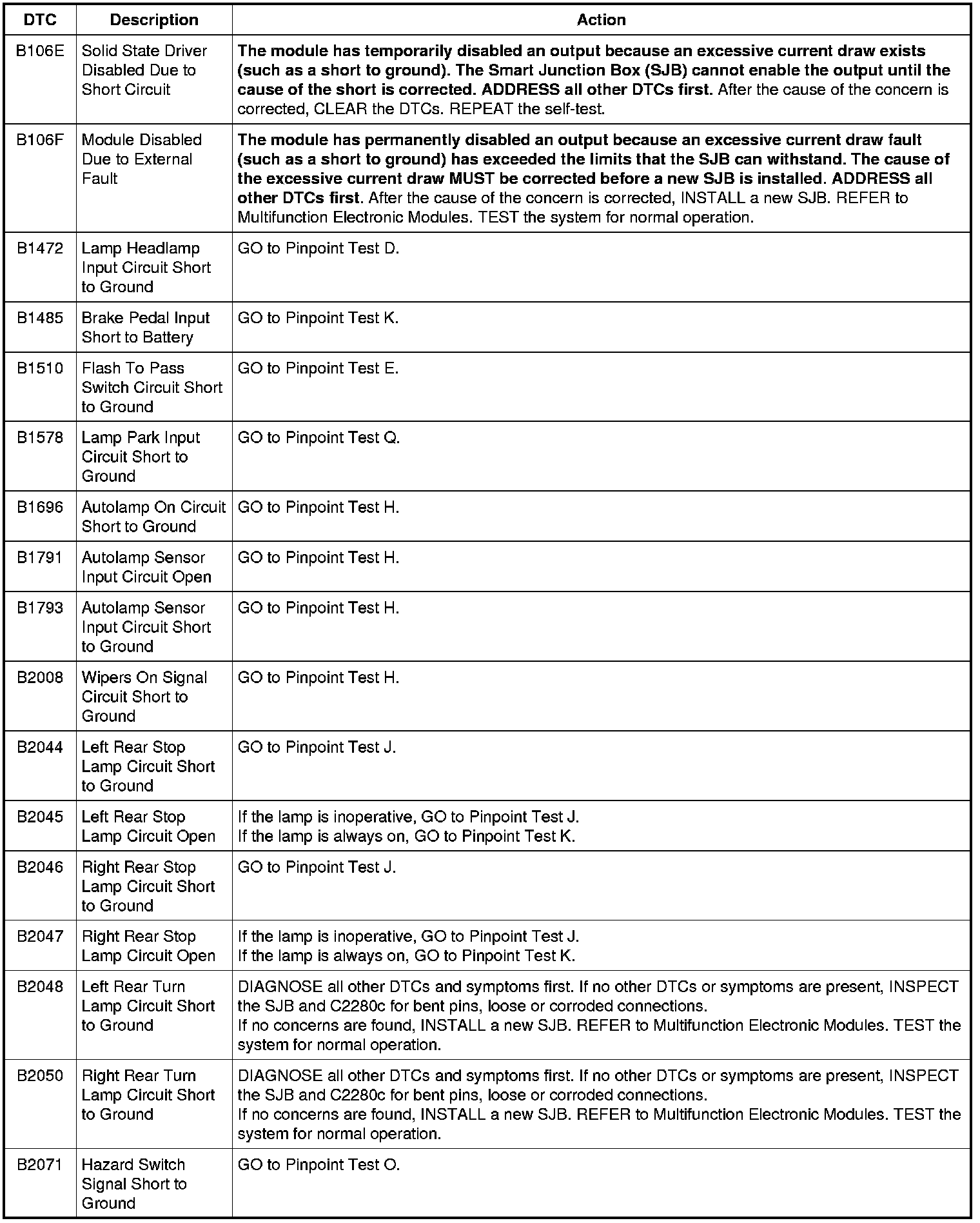 Smart Junction Box (SJB) DTC Chart
