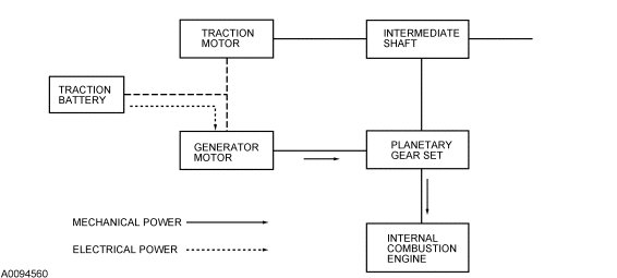 In this mode the internal combustion engine is running and powering the generator motor which produces the electricity. The power from the engine is split between the path through the generator motor and the path to the output shafts of the vehicle. The electricity produced by the generator motor charges the high voltage traction battery or powers the traction motor. In this mode the traction motor can operate as a motor or as a generator to make up the difference between engine power and desired power at the wheels. This mode is preferred whenever the traction battery needs to be charged.