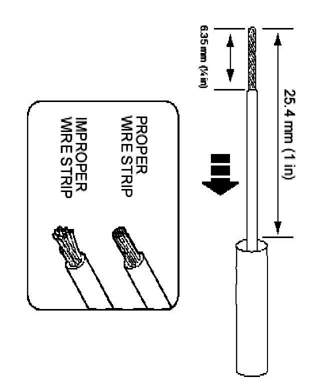 2. Strip 6.35mm (1/4 in) of insulation from each wire end, taking care not to nick or cut wire strands.