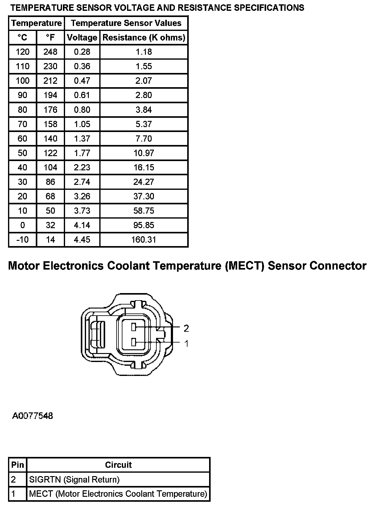 Temperature Sensor Voltage And Resistance Specifications And Motor Electronics Coolant Temperature (MECT) Sensor Connector:
