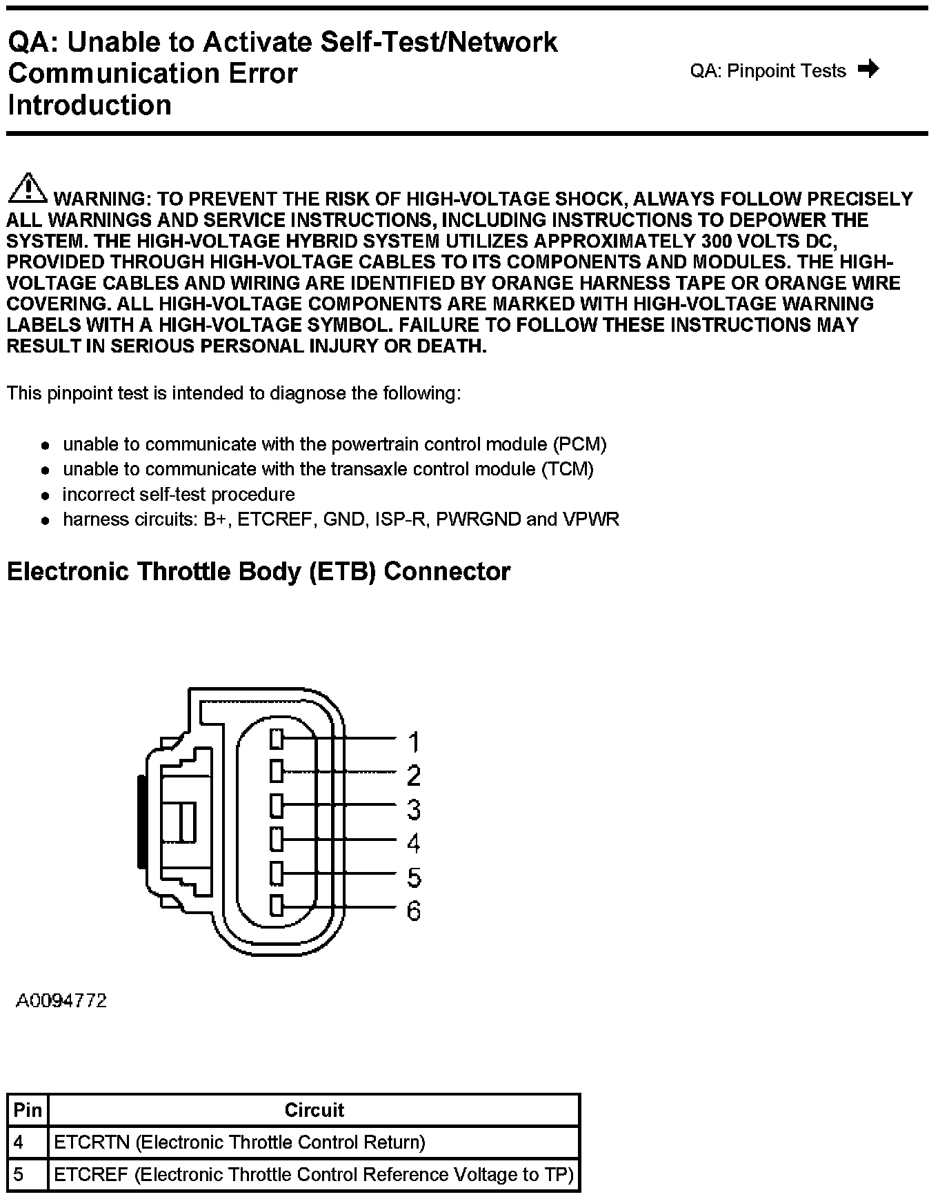 PINPOINT TEST QA: UNABLE TO ACTIVATE SELF-TEST/NETWORK COMMUNICATION ERRORWarning And Electronic Throttle Body (ETB) Connector: