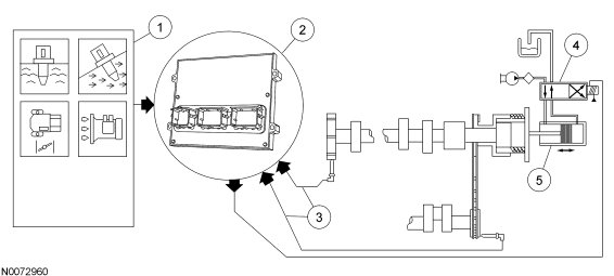 1. The PCM receives input signals from the intake air temperature (IAT), cylinder head temperature (CHT), CMP, accelerator pedal position (APP) sensor (via requested torque), mass air flow (MAF), and CKP sensors to determine the operating conditions of the engine. At idle and low engine speeds with closed throttle, the PCM controls the camshaft position based on engine oil temperature and engine speed inputs. During cold start emissions reduction mode, the camshaft position is determined via engine speed and estimates of engine coolant temperature and catalyst temperature (estimated from other sensors already used such as IAT/CHT/MAF/CKP). During part and wide open throttle, the camshaft position is determined by engine RPM, load and accelerator pedal position. The VCT system does not operate until the engine is at normal operating oil temperature.