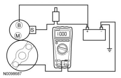 7. Remove the cables from solenoid B-, S- and M-terminals. Clean the cables and connections and reinstall the cables to the correct terminals. Repeat Steps 3 through 6. If the voltage drop reading is still greater than 0.8 volt when checked at the M-terminal and less than 0.8 volt when checked at the B-terminal, the concern is in the solenoid contacts. Install a new starter motor.