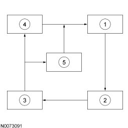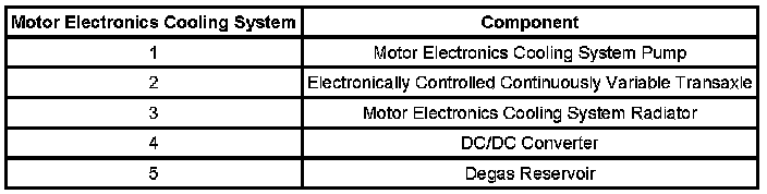 The motor electronics cooling system is required to maintain an acceptable temperature for the transaxle and the DC/DC converter. The system temperature is monitored by the motor electronics coolant temperature (MECT) sensor, which is an input to the PCM. The PCM commands the MECS pump using the MECS pump relay. The MECS pump is commanded on whenever the traction battery contactors are closed. The coolant in the system flows in a loop from the MECS pump, to the transaxle, then into the MECS radiator bottom hose port, out of the top hose port of the MECS radiator, into the DC/DC converter, and back into the MECS pump. The cooling system has a degassing system that is connected in parallel between the MECS radiator and the MECS pump. The degassing system bleeds air/gases into the degas reservoir.