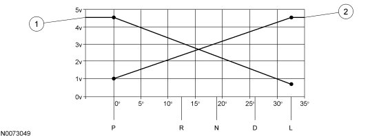 The TR-A1 signal has a negative voltage slope, meaning the voltage decreases when the sensor angle increases. The typical TR voltage ranges from approximately 4.3 volts in the PARK position to approximately 0.6 volt in the LOW gear position. The TR-A2 signal has a positive voltage slope. Voltages increase as the sensor angle increases. The typical voltage for the TRA2 is about 1 volt in the PARK position to about 4.4 volts in the LOW gear position.