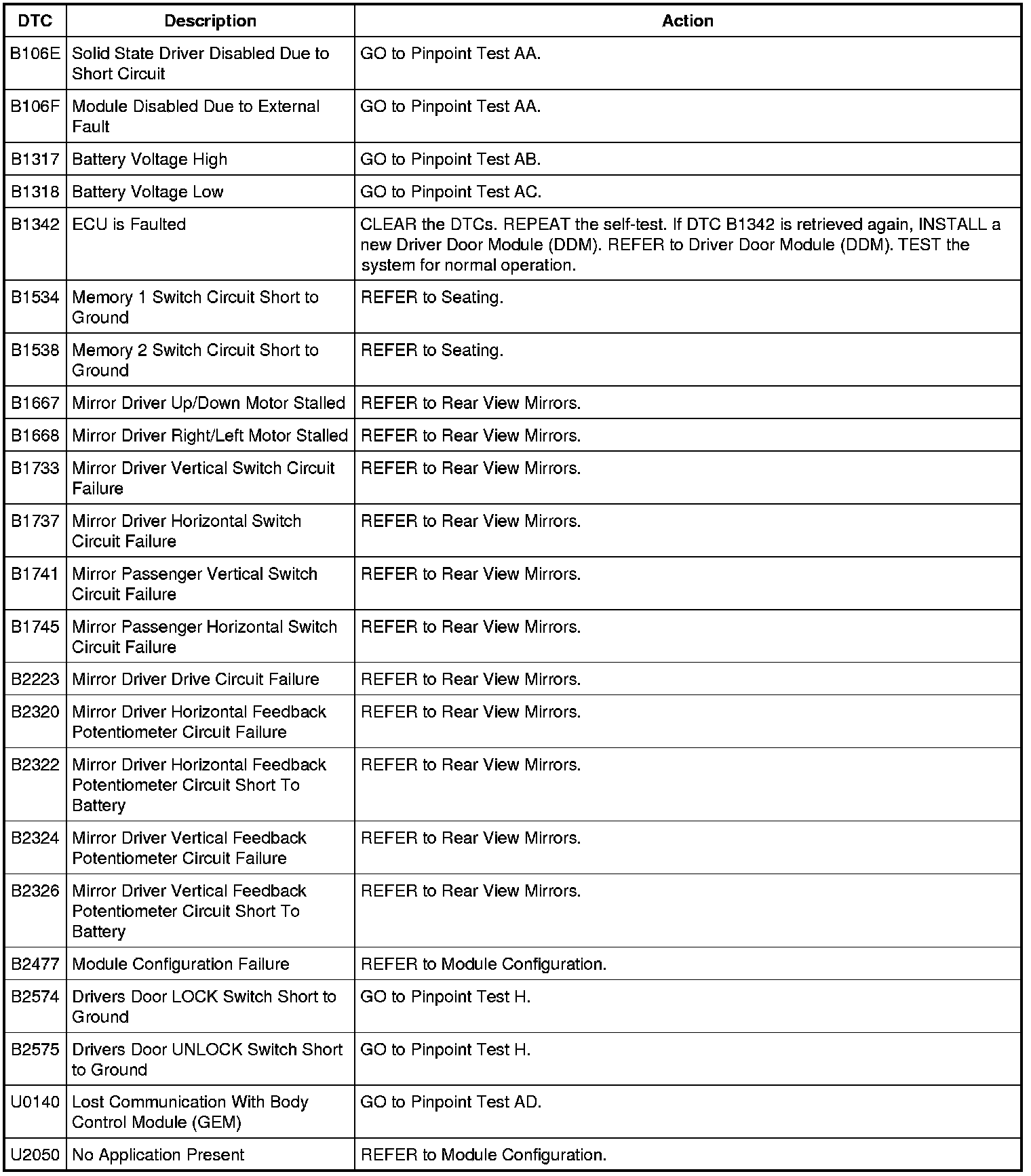Driver Door Module (DDM) DTC Chart