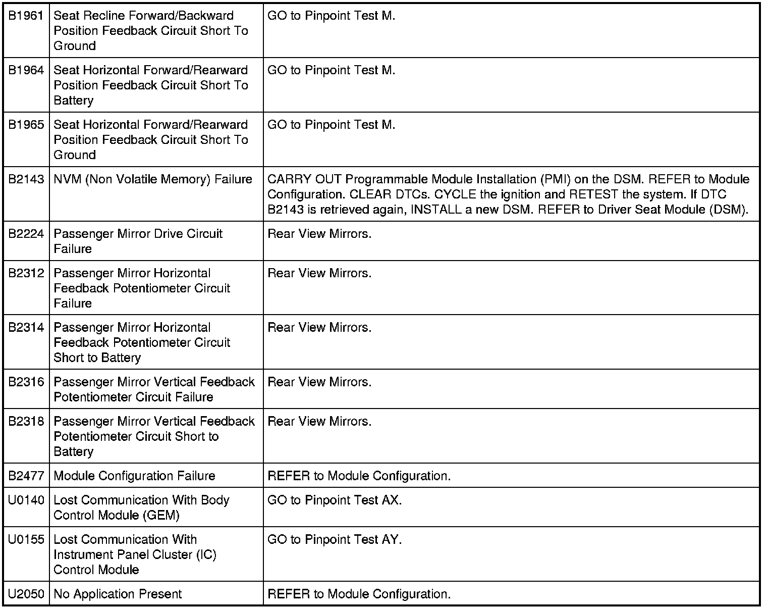Driver Seat Module (DSM) DTC Chart