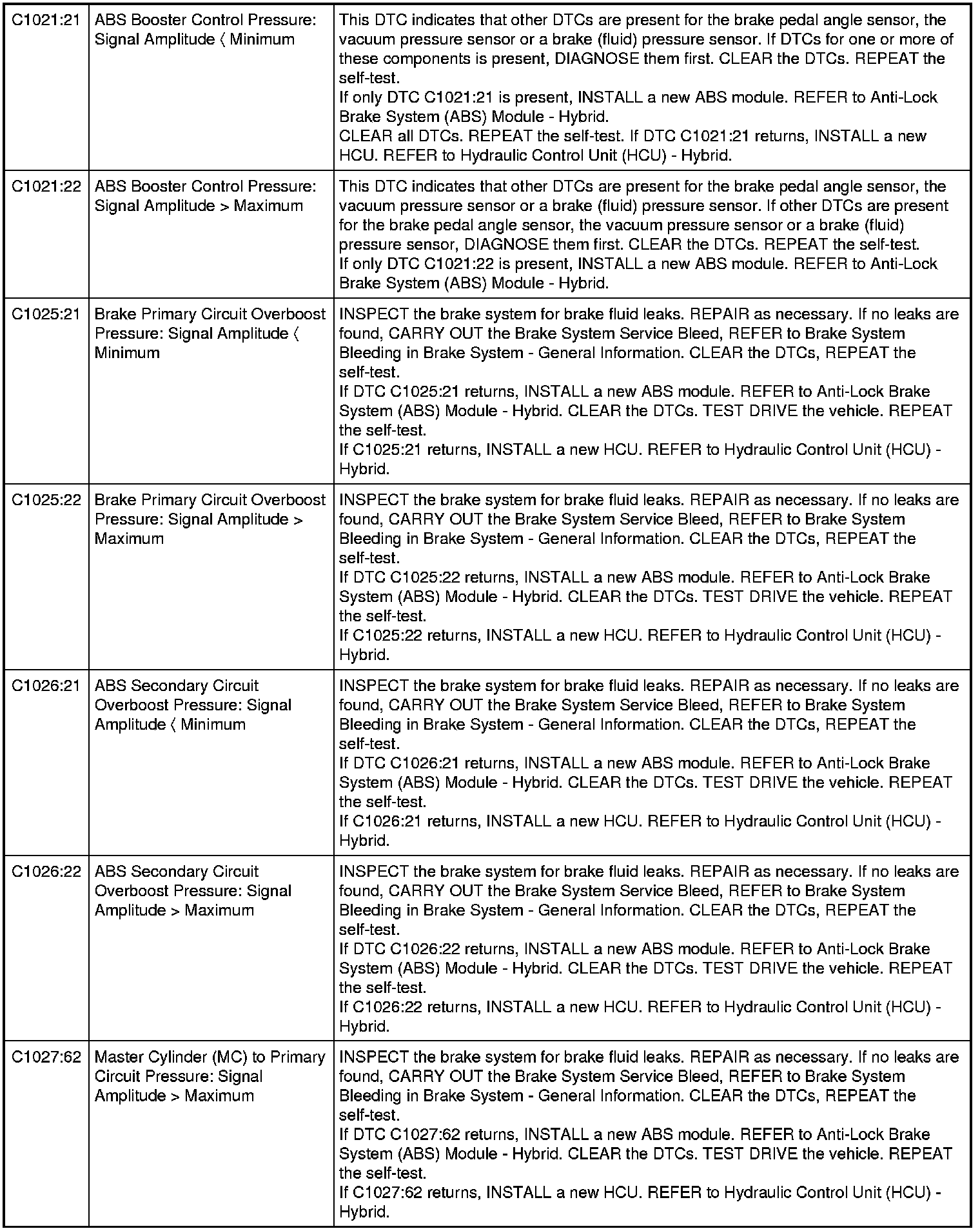 NOTE: This DTC chart applies to hybrid vehicles only. For non-hybrid vehicle DTCs, refer to the ABS Module DTC Chart in Anti-Lock Control - Non-Hybrid.