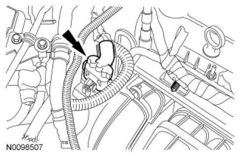 Release the clips and locking tabs and disconnect the interlock connector and the high-voltage cable connector at the Air Conditioning Compressor Module (ACCM).