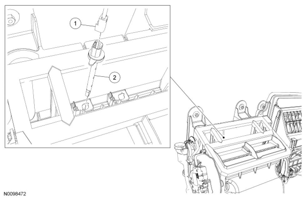 2. Rotate the A/C evaporator discharge air temperature sensor counterclockwise and pull upward to detach it from the heater core and evaporator core housing.