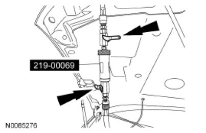 NOTE: Ford Motor Company vehicles are produced with R-134a fluorescent dye installed in the refrigerant system from the factory. The location of leaks can be pinpointed by the bright yellow-green glow of the fluorescent dye under a UV lamp. Since more than one leak can exist, make sure to inspect each component, line and fitting in the refrigerant system for a leak.