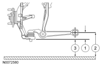 1. Measure the distance between the flat level surface and center of the lower arm inboard cam bolt (measurement 2).