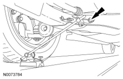 1. Position a suitable surface gauge (such as Starrett 57D Surface Gauge), on a flat, level surface and adjust the arm of the gauge until the scriber point is located in the center of the front lower arm-to-subframe bolt.