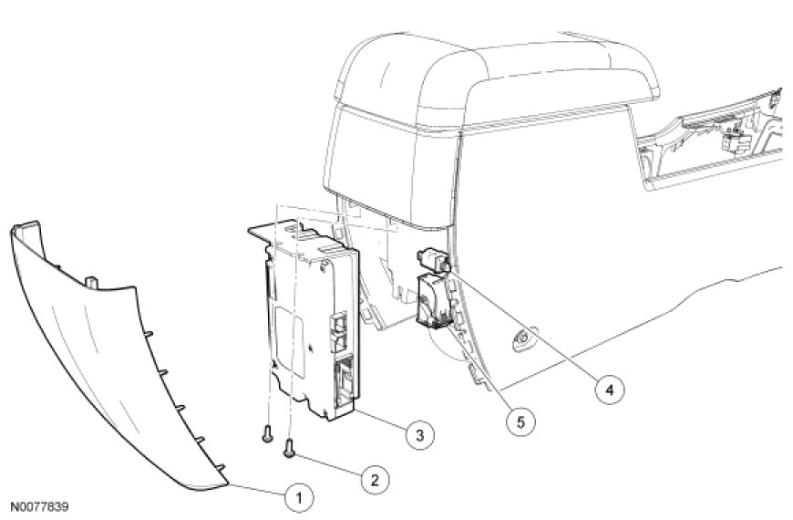 2. Remove the floor console rear trim panel by pulling out at the bottom to disengage the clips then rotating the bottom of the panel out to release the upper retaining tabs.