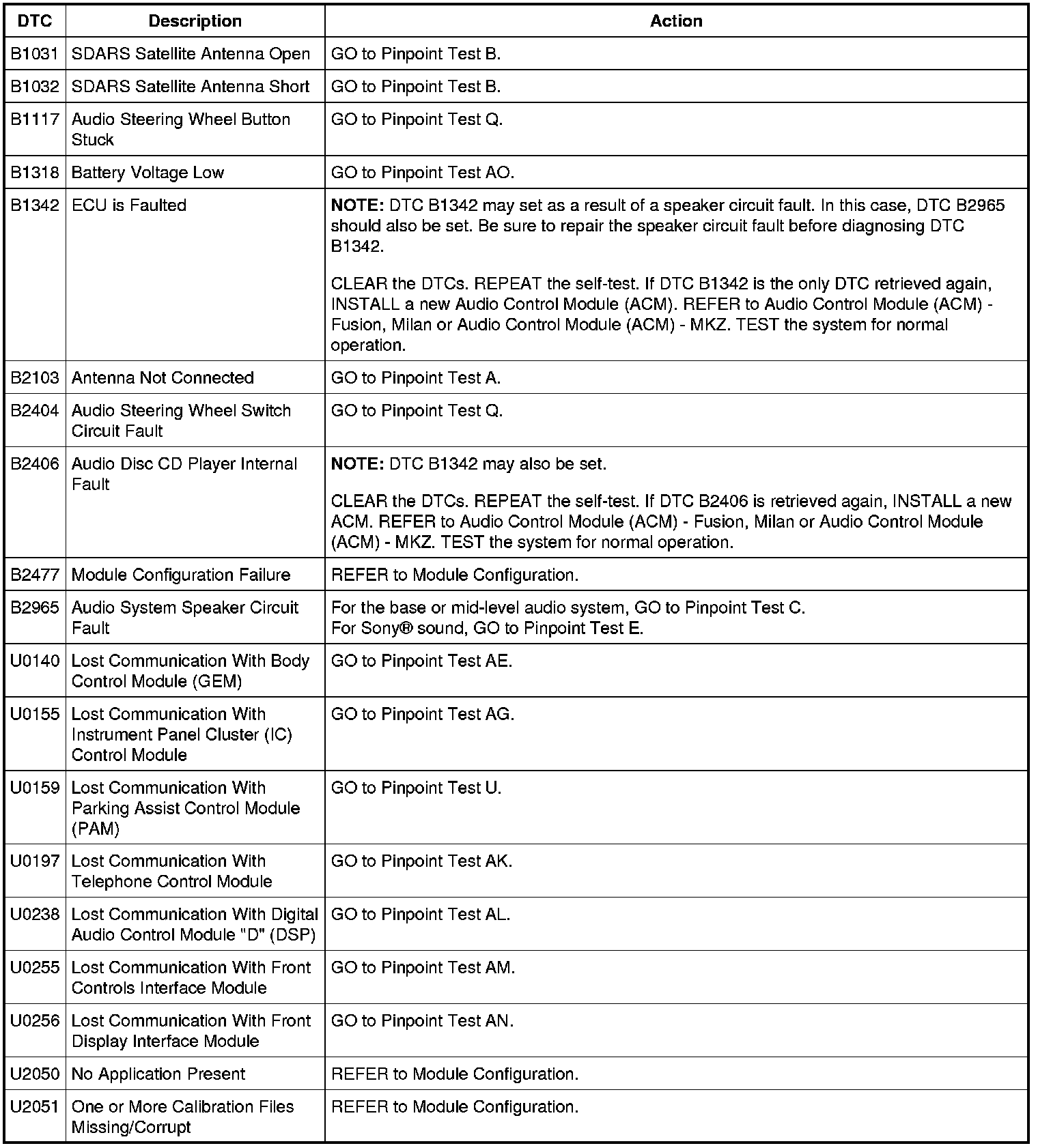 Audio Control Module (ACM) DTC Chart - Fusion, Milan Without Navigation