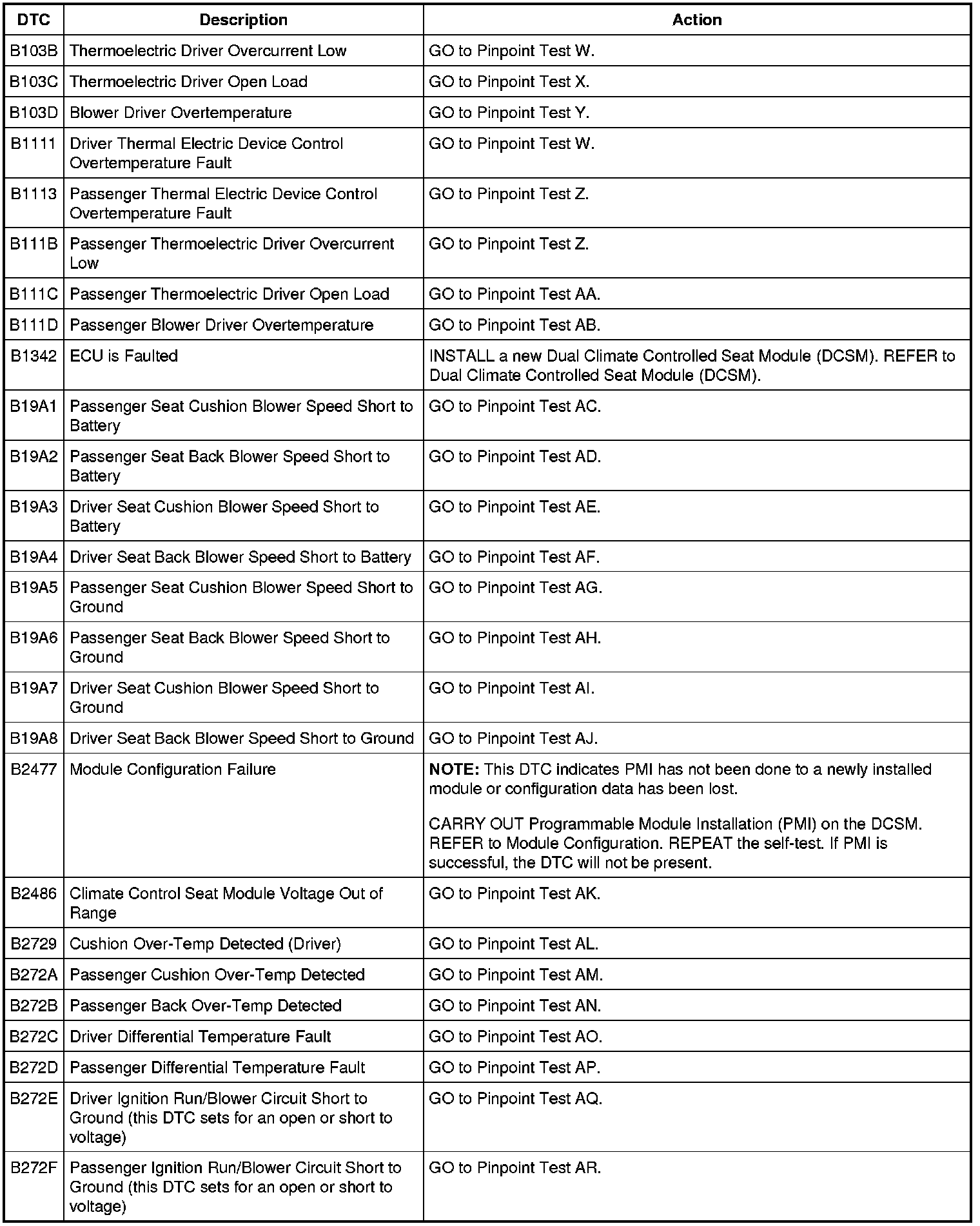 Dual Climate Controlled Seat Module (DCSM) DTC Chart