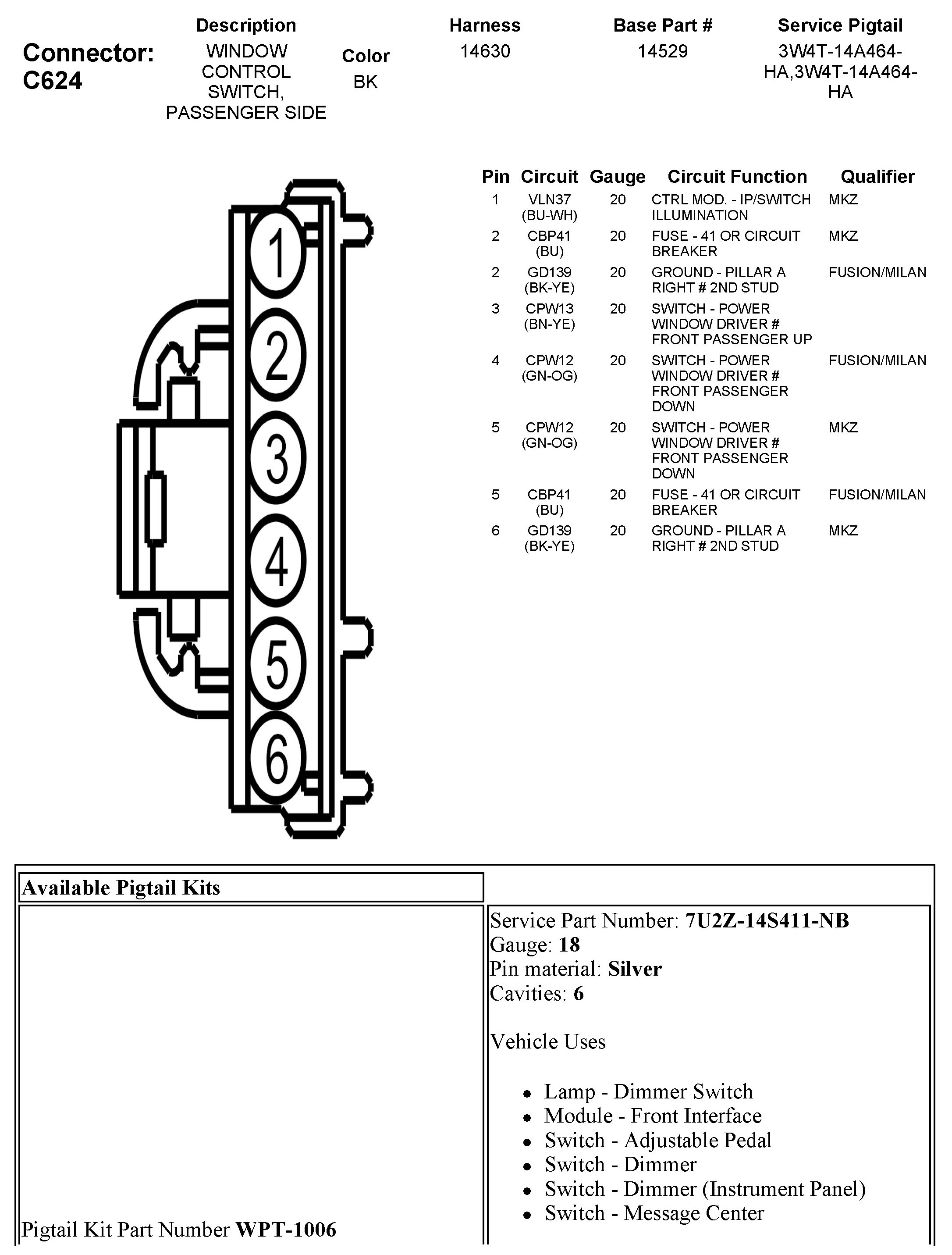 C624 Window Control Switch, Passenger Side