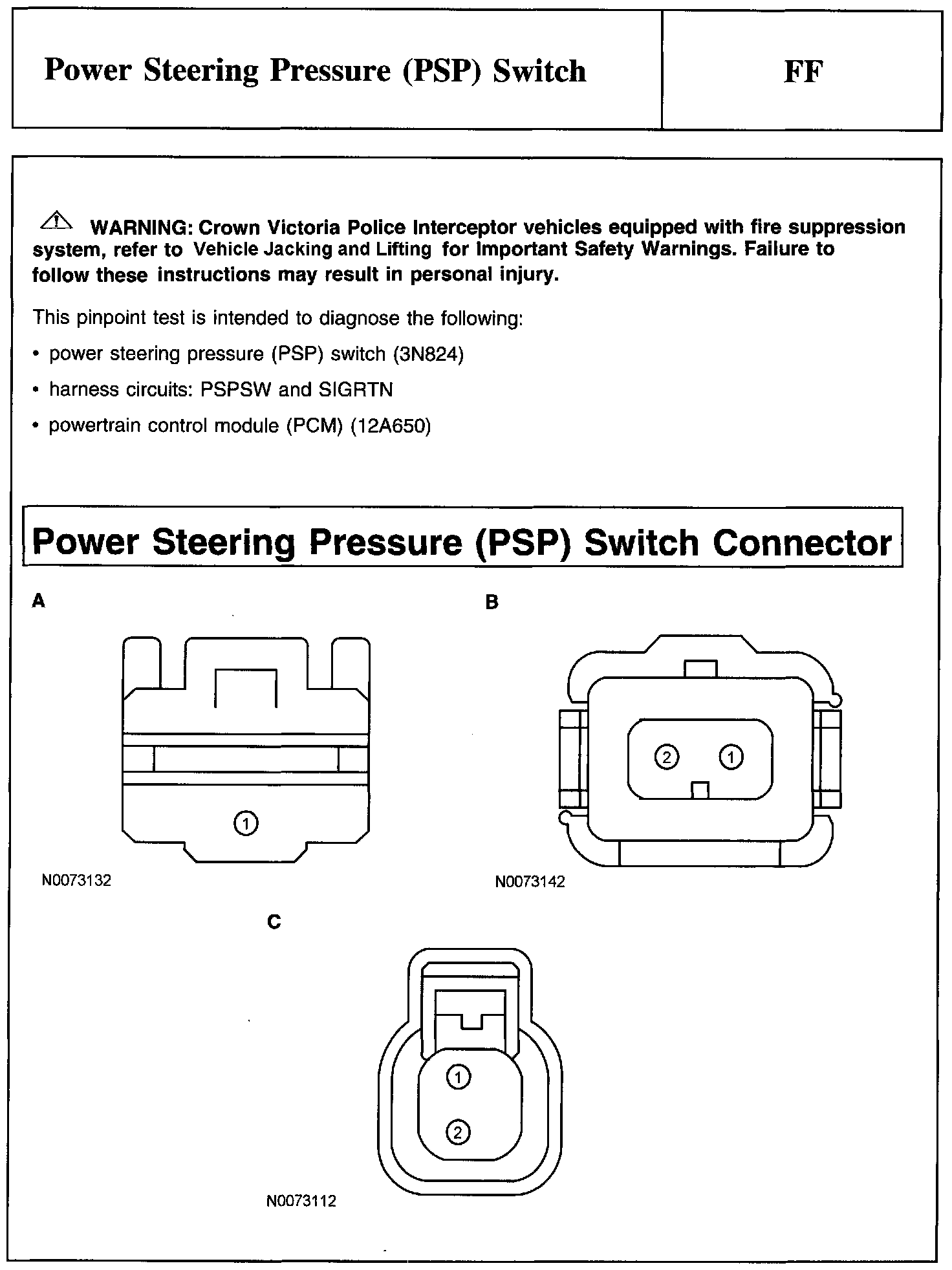 PINPOINT TEST FF: POWER STEERING PRESSURE (PSP) SWITCHWarning And Power Steering Pressure (PSP) Switch Connector: