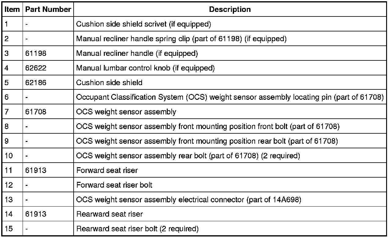 WARNING: Use care when handling the front passenger seat and track assembly. Dropping the assembly, placing excessive weight on or sitting on a front passenger seat that is not secured in the vehicle may result in damaged seat components. Failure to follow these instructions may result in incorrect operation of the occupant classification system (OCS) and increases the risk of serious personal injury or death in a crash.