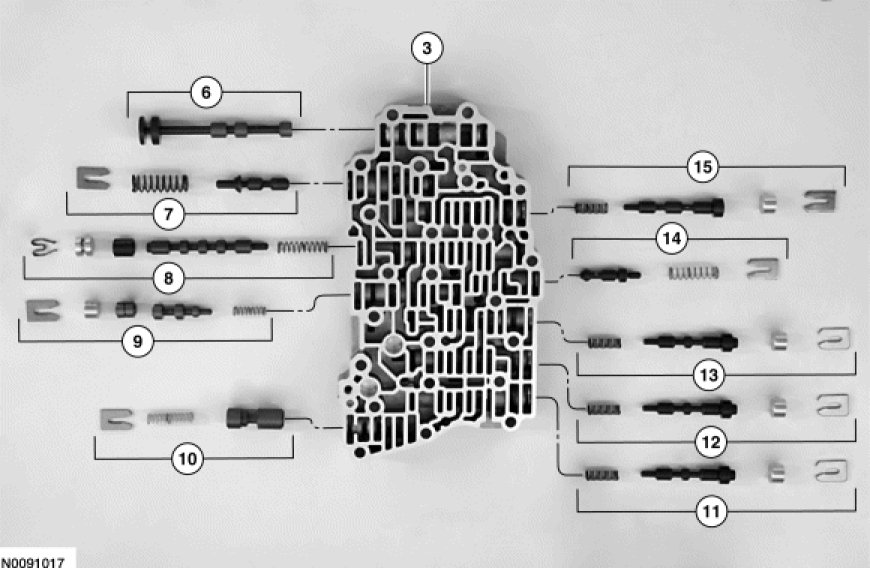 5. NOTICE: Remove the valves by tapping the valve body on the palm of the hand to slide the valves out of the bores or by threading a 4-mm bolt into the valves and pulling them out. It may be necessary to remove the valves and springs using a pick. If it is necessary to use a pick, use extreme caution to prevent damaging the valves or valve bores. If necessary, disassemble parts of the main control valve body in small groups. Take special care when handling the main control components, since they are the most precise and delicate parts of the transaxle. Neatly arrange the parts as they are removed to avoid mixing similar pieces.