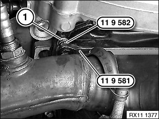 Remove bolt (1) above exhaust manifold using special tools 11 9 582 and 11 9 581.