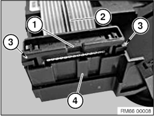 1. Check both sides of plug connection of ribbon cable (1) to slide-in unit for radio-operated key (4) for correct locking (3).