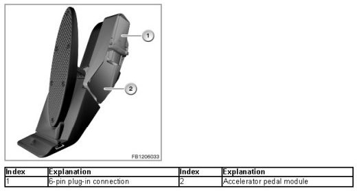 The accelerator pedal module detects the position of the accelerator pedal. The DME control unit uses this to calculate the required position of the throttle valve, taking account of other factors.