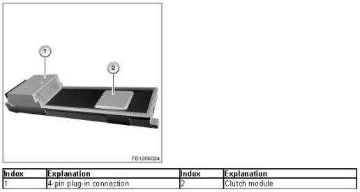 On vehicles with manual gearboxes, the clutch module at the clutch pedal picks up the clutch position (clutch pressed: clutch switch open; clutch not pressed, clutch switch closed). The clutch module consists of a clutch switch and an electronic evaluation unit.