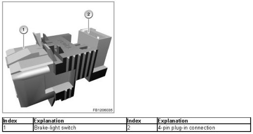 Two switches are built into the brake-light switch: the brake-light switch and the brake-light test switch (redundancy for safety reasons). The signals indicate to the DME control unit whether the brake pedal has been pressed.