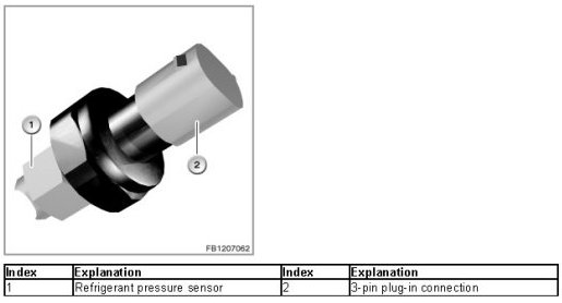 The refrigerant pressure sensor for the air conditioning system is located in the pressure line of the refrigerant circuit. In the cooling mode the refrigerant high pressure is picked via the pressure sensor are evaluated in the DME.