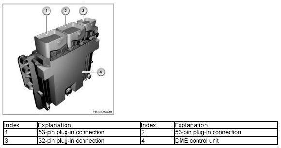 The DME control unit is connected with the vehicle electrical system via the engine wiring harness and vehicle wiring harness (3 connector chambers).